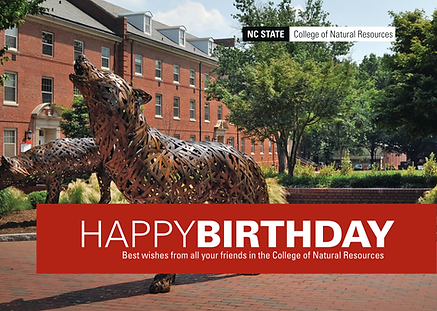 A vibrant, two-page birthday greeting card sent to students and staff, complete with postage-friendly design and space for addresses—a warm, personal touch from their College of Natural Resources family.